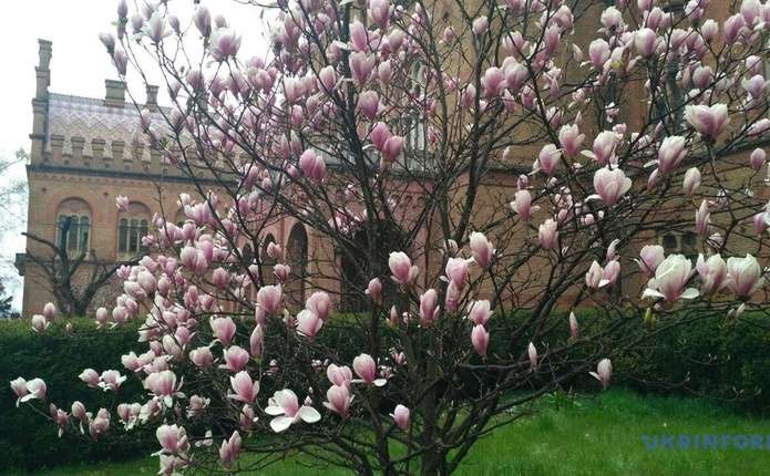 “У дворику перед Резиденцією (пам’ятка архітектури – Резиденція митрополитів Буковини і Далмації, – в якій нині розташований Чернівецький національний університет імені Юрія Федьковича – ред.) почали квітнути одразу чотири деревця магнолій. Два із них – більш крислаті, їх висадили ще десь наприкінці 1970-х років. А два дерева магнолії молоді, їм приблизно 8-9 років. Це вид магнолії Суланжа. Зараз, після послаблення карантинних обмежень, туристи почали активно фотографуватися біля магнолій”, – розповідає екскурсовод університету Анжела Бота.