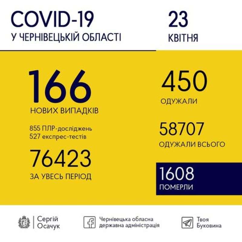 У Чернівецькій області за минулу добу зафіксували 166 нових випадків інфікування COVID-19. Лабораторний центр зробив 855 ПЛР-досліджень та 527 експрес-тестів.