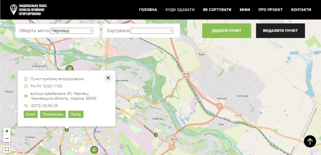 На мапі є чимало відміток: спеціалізовані пункти, баки для сортування, станції. Кожна точка на карті містить актуальні дані про години роботи, адресу та контакти.