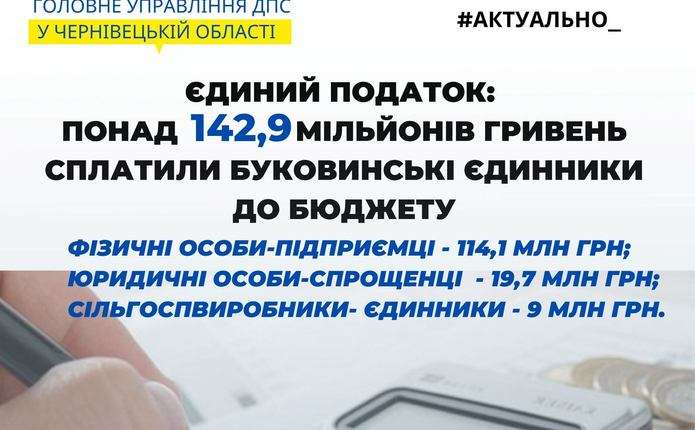 У Головному управлінні ДПС у Чернівецькій області інформують, у першому кварталі 2021 року до місцевих бюджетів Буковини платники податків сплатили понад 142,9 млн грн єдиного податку, що на 14,3 млн грн більше, ніж надійшло за аналогічний період минулого року.