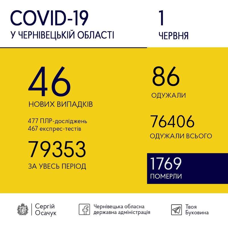 1 червня на Буковині виявили 46 нових випадків коронавірусу.