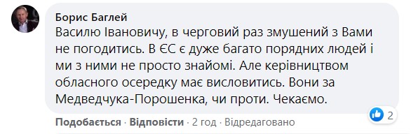 У коментарях до допису, колишній заступник голови ОДА Борис Баглей, зазначив, що в партії «Європейська солідарність» насправді багато порядних людей, але керівництво обласного осередку, в обличчі Михайла Павлюка, має висловитись вони за Медведчука-Порошенка чи проти.
