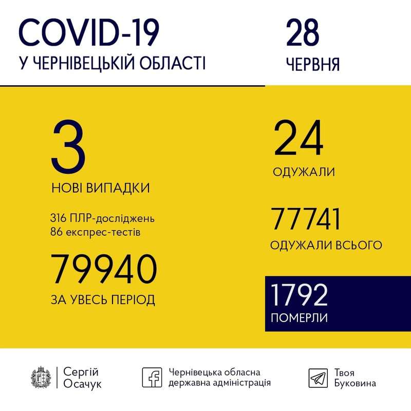 28 червня на Буковині виявили 3 нових випадки коронавірусу.
