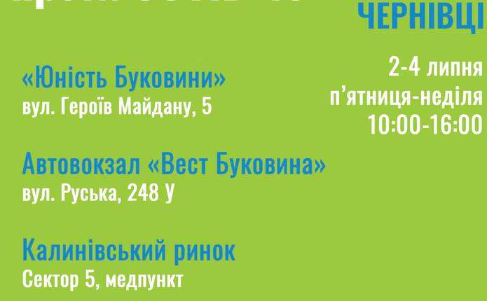 Три центри масової вакцинації від COVID-19 працюватимуть на Буковині 2, 3 та 4 липня 2021 року. Про це повідомляє Чернівецька ОДА у facebook. Це: