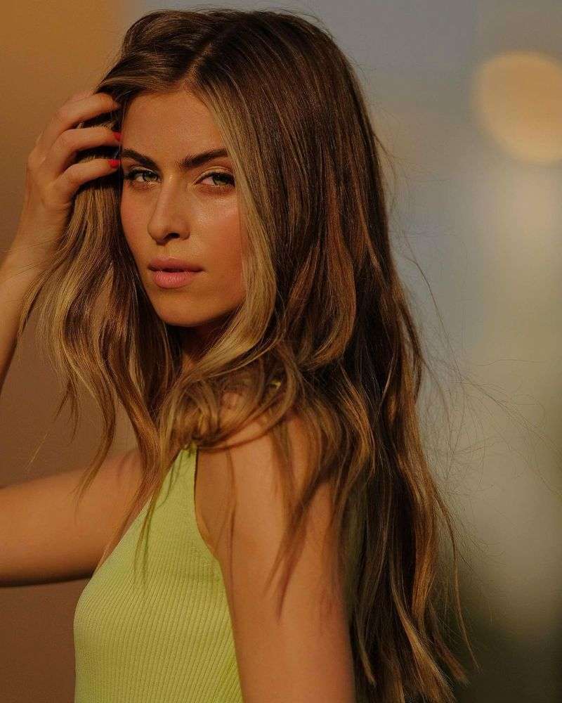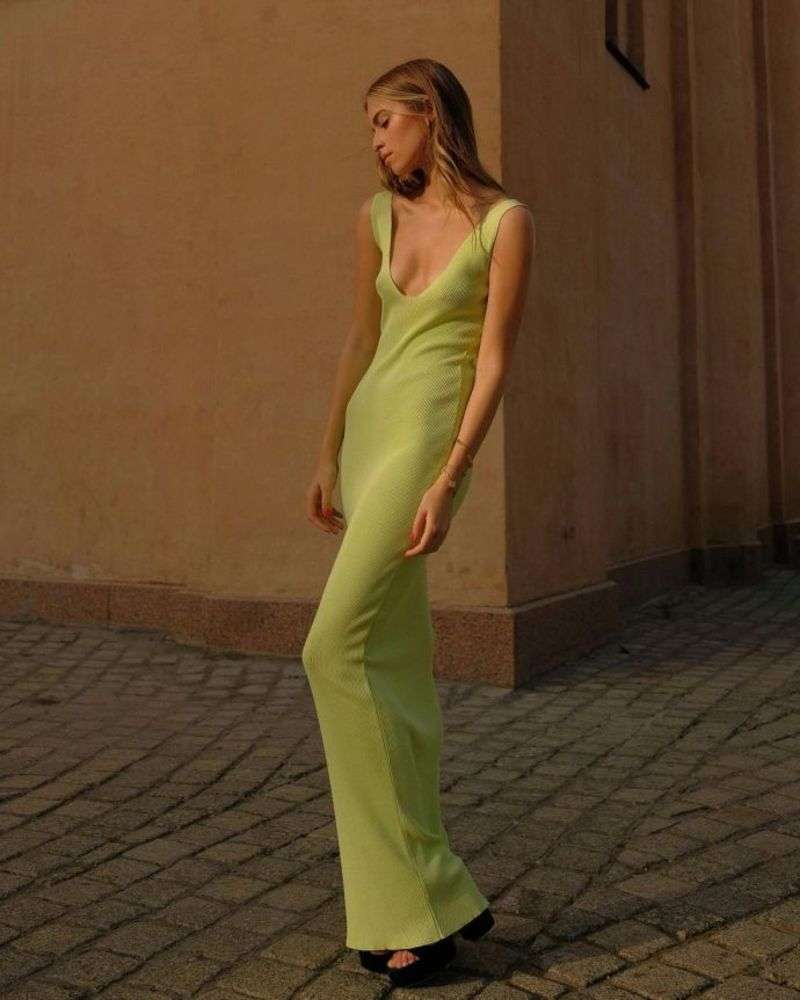 Красуня попозувала у ніжно-салатовій сукні, яка не лише підкреслила стрункість моделі, а й пікантно підкреслила її декольте.