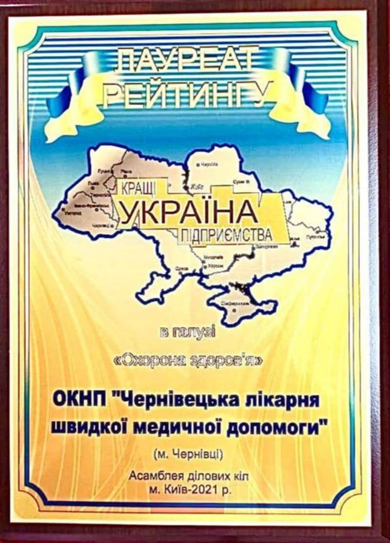 Також високо оцінили діяльність трудового колективу закладу – ОКНП «Чернівецька лікарня швидкої медичної допомоги» включили до числа Лауреатів Всеукраїнського галузевого рейтингу «Кращі підприємства України» у галузі «Медицина». Про це повдіомляє пресслужба Чернівецької обласної ради.