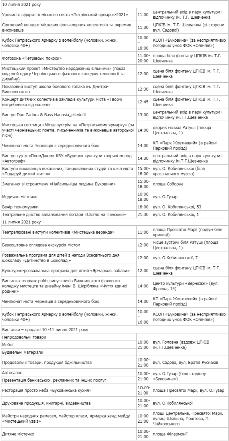 10-11 липня 2021 р. в місті Чернівці відбудеться традиційне міське свято «Петрівський ярмарок». Місцями проведення визначено: вулиці Головну, Садову, О. Гузар, О. Кобилянської, Шкільну, площі Пресвятої Марії, Соборну та Центральну (резервні вулиці: Мирона Кордуби та Братів Руснаків, Бетховена, Чайковського, Заньковецької, Поштова та площу Філармонії з вулицями навколо неї). Про це йдеться на офіційному сайті Чернівецької міської ради.