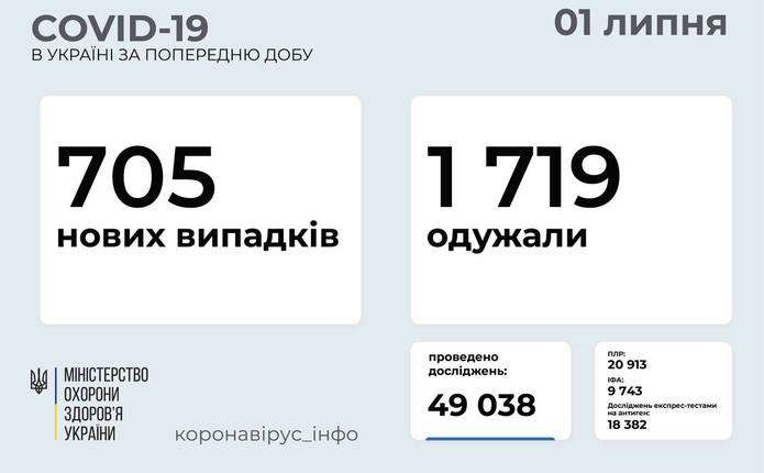 705 нових випадків коронавірусної хвороби COVID-19 зафіксовано в Україні станом на 1 липня 2021 року. Зокрема, захворіли 28 дітей та 18 медпрацівників. Про це інформує телеграм-канал Коронавірус Інфо.