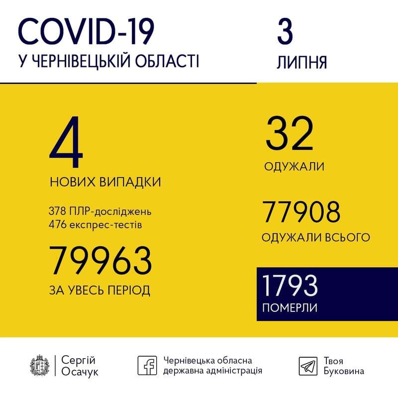 3 липня на Буковині виявили 4 нових випадки коронавірусу.