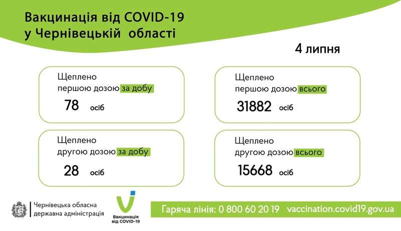 Сьогодні, 3 липня, у Чернівецькій області від COVID-19 щепили всього 106 осіб, у тому числі: першою дозою – 78, другою дозою – 28.