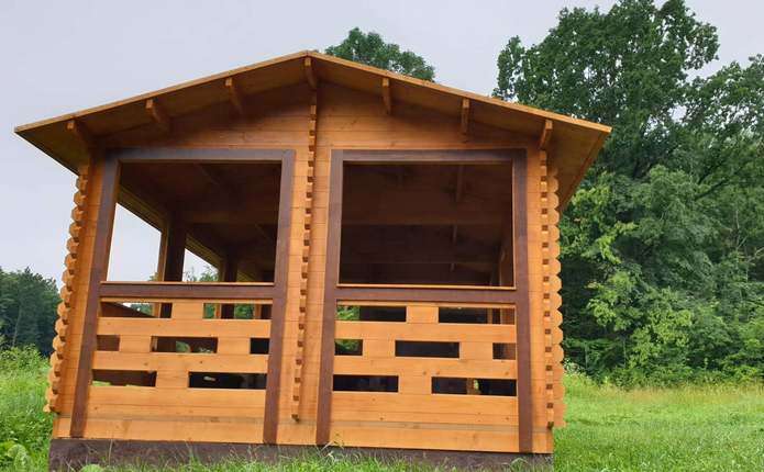 Літній дерев’яний будиночок милує око за рахунок простоти виконання, і виглядає досить надійно та естетично. Опори, огорожа, підлога і столи з лавами оброблені захисною сумішшю, що додає природньому матеріалу неповторного шарму. Дах перекрито сучасним, гарним, легким і надійним матеріалом – ондуліном.
