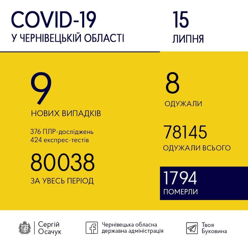 15 липня на Буковині виявили 9 нових випадків коронавірусу.