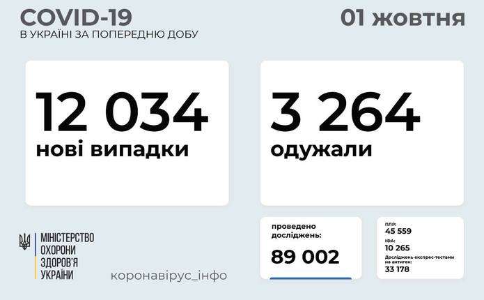 12 034 нових випадки COVID-19 зафіксовано в Україні станом на 1 жовтня 2021 року. Зокрема, захворіли 1 059 дітей та 248 медпрацівників. Про це інформує телеграм-канал Коронавірус Інфо.