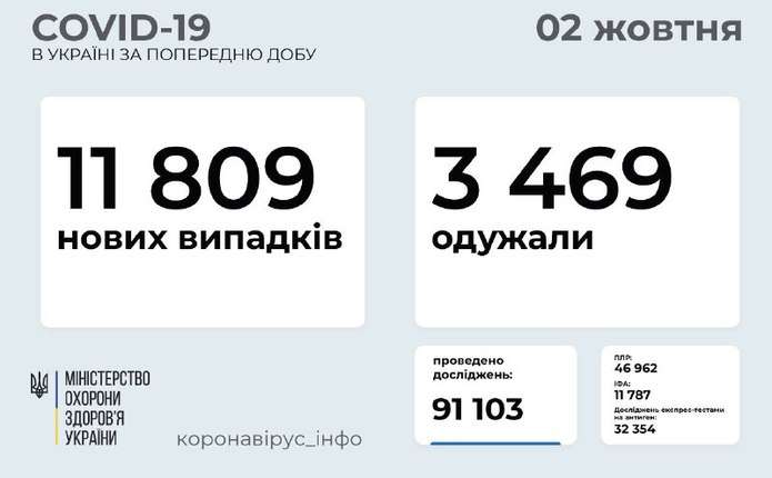 11 809 нових випадків COVID-19 зафіксовано в Україні станом на 2 жовтня 2021 року. Зокрема, захворіли 1 104 дитини та 235 медпрацівників. Про це інформує телеграм-канал Коронавірус Інфо.