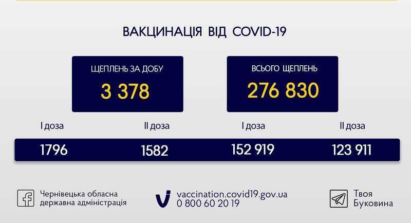Крім того, за минулу добу в області зробили 3378 щеплень від COVID-19, першою дозою вакцинувалися 1796 осіб, другою – 1582. За весь період на Буковині зробили 276 830 щеплень, з них першою дозою імунізувалися 152 919 людей, другою – 123 911.