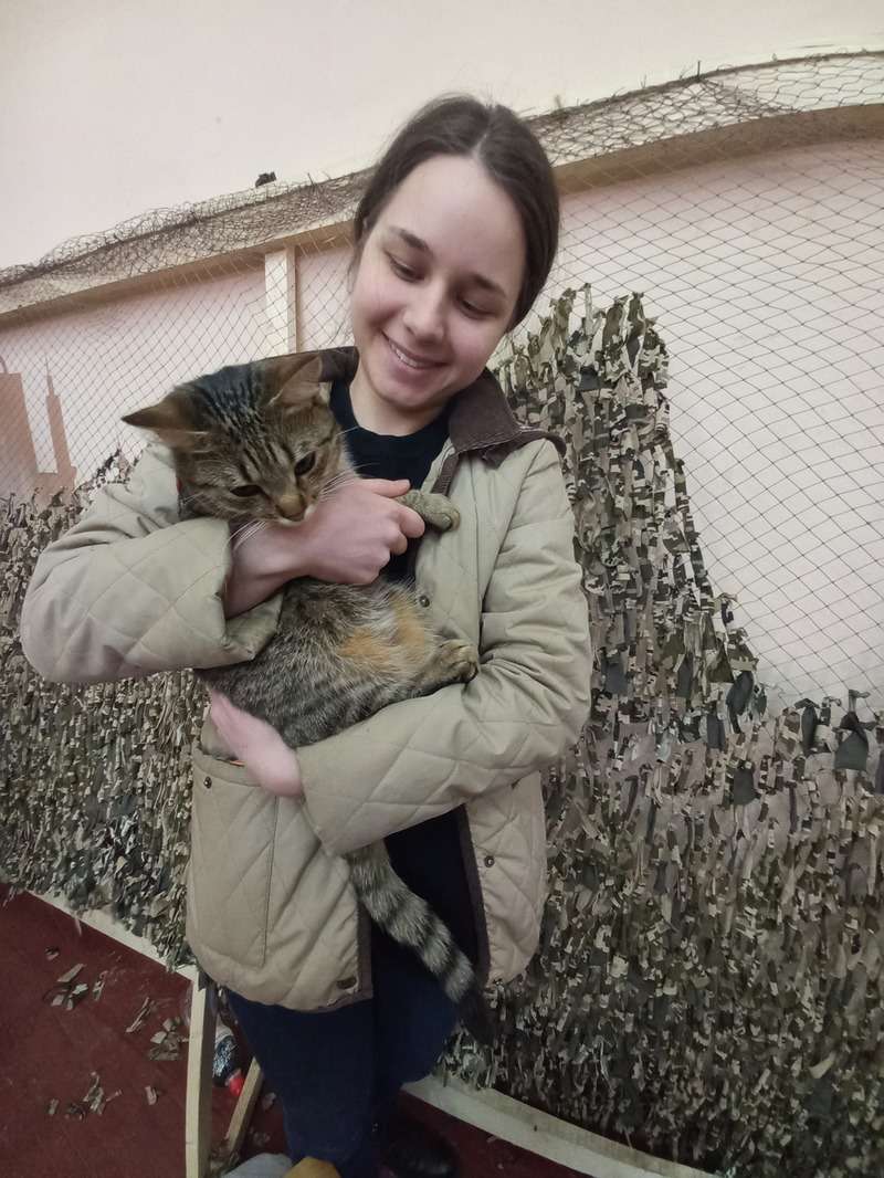 Аня приїхала до Чернівців з Київської області. Вона разом зі своєю кішкою Масянею плете маскувальні сітки для українських воїнів.