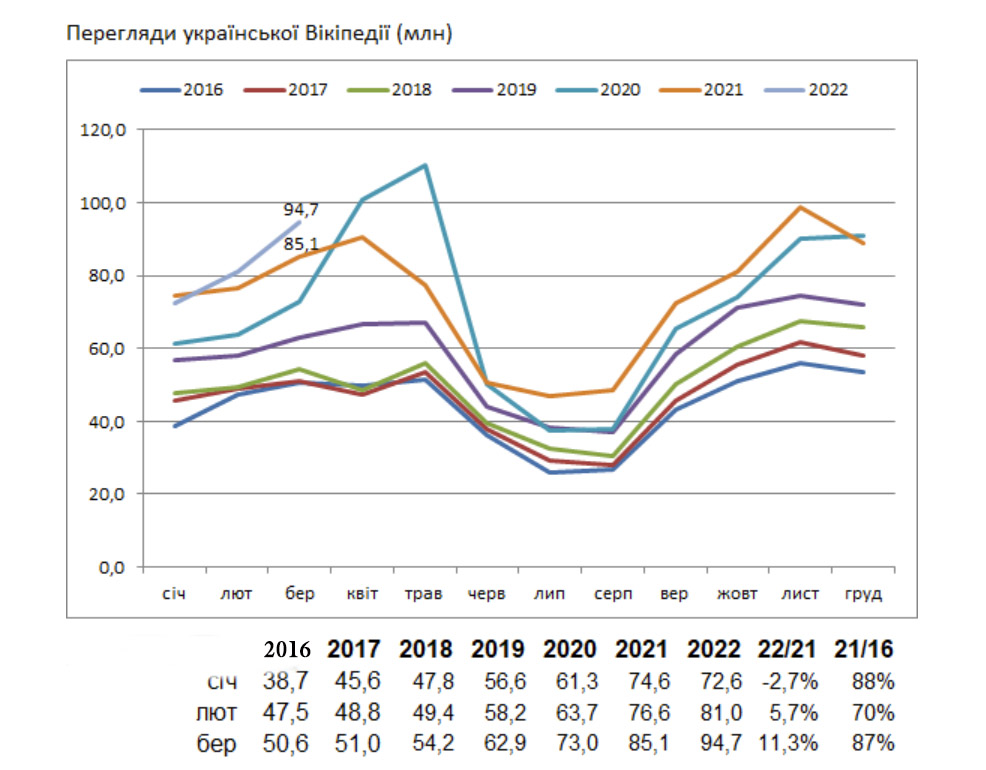 Популярність української Вікіпедії у березні 2022 виросла на 11%