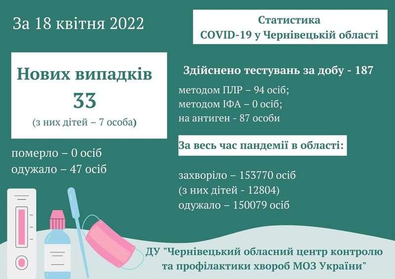 За добу 18 квітня 2022 року в Чернівецькій області зафіксовано 33 нових випадків коронавірусної хвороби COVID-19 (з них дітей – 7, медпрацівників – 0).