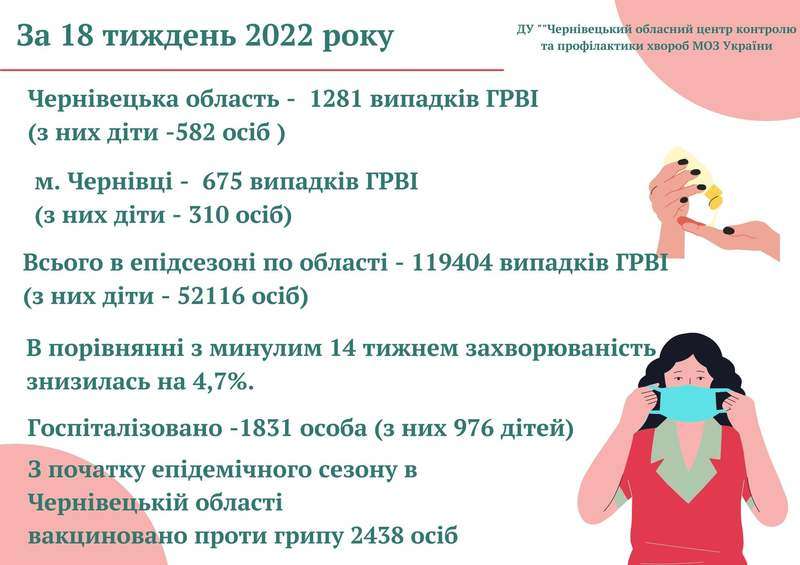 За даними рутинного епідеміологічного нагляду за 15 тиждень 2022 року в Чернівецькій області зареєстровано 1281 випадків ГРВІ, з яких 582 серед дітей (45,4%). Інтенсивний показник захворюваності становить 143,37 на 100 тисяч населення, та знаходиться нижче рівня епідемічного порогу на 70,8%. В порівнянні з минулим 14 тижнем захворюваність знизилась на 13,0%.