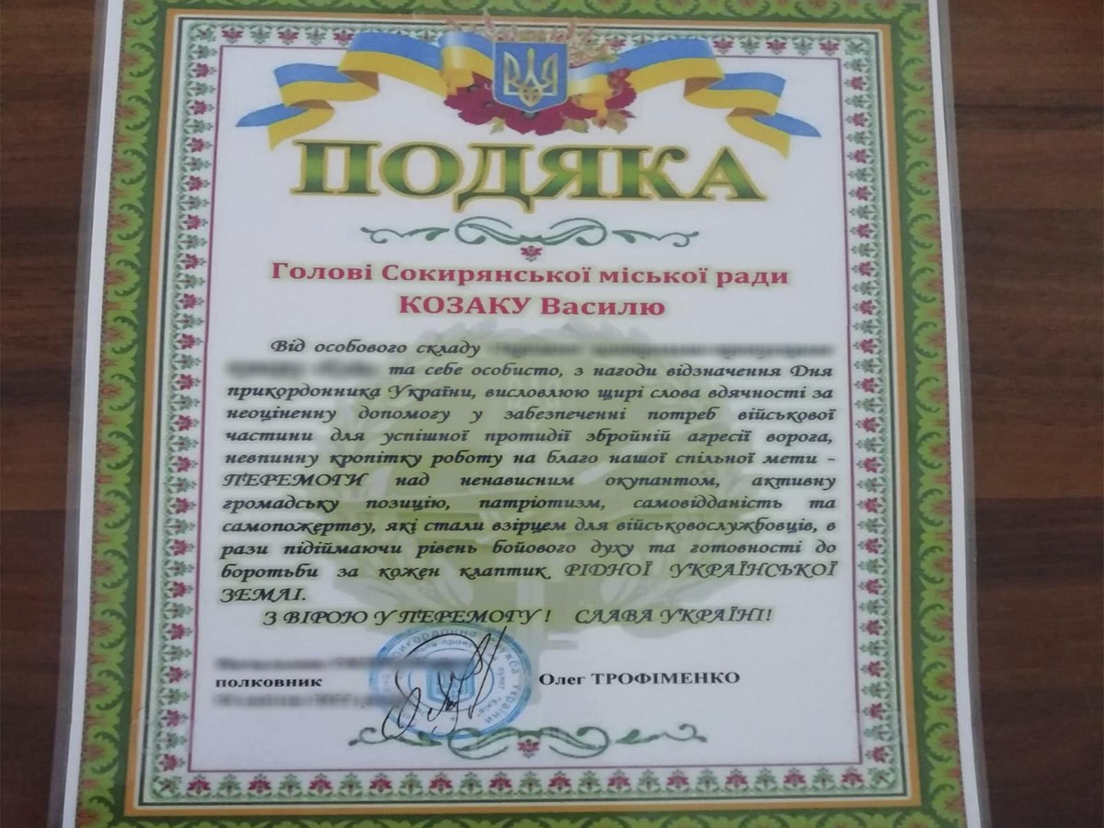 І днями на адресу Сокирянської міської ради надійшла Подяка від однієї із військових частин прикордонної служби України, в якій мужні оборонці дякують в особі Сокирянського міського голови Василя Козака всім жителям громади, які вносять свою частину підтримки для наближення нашої перемоги. Дякують «за неоціненну допомогу у забезпеченні потреб військової частини для успішної протидії збройній агресії ворога, невпинну кропітку роботу на благо нашої спільної мети – ПЕРЕМОГИ над ненависним окупантом».