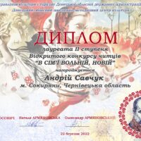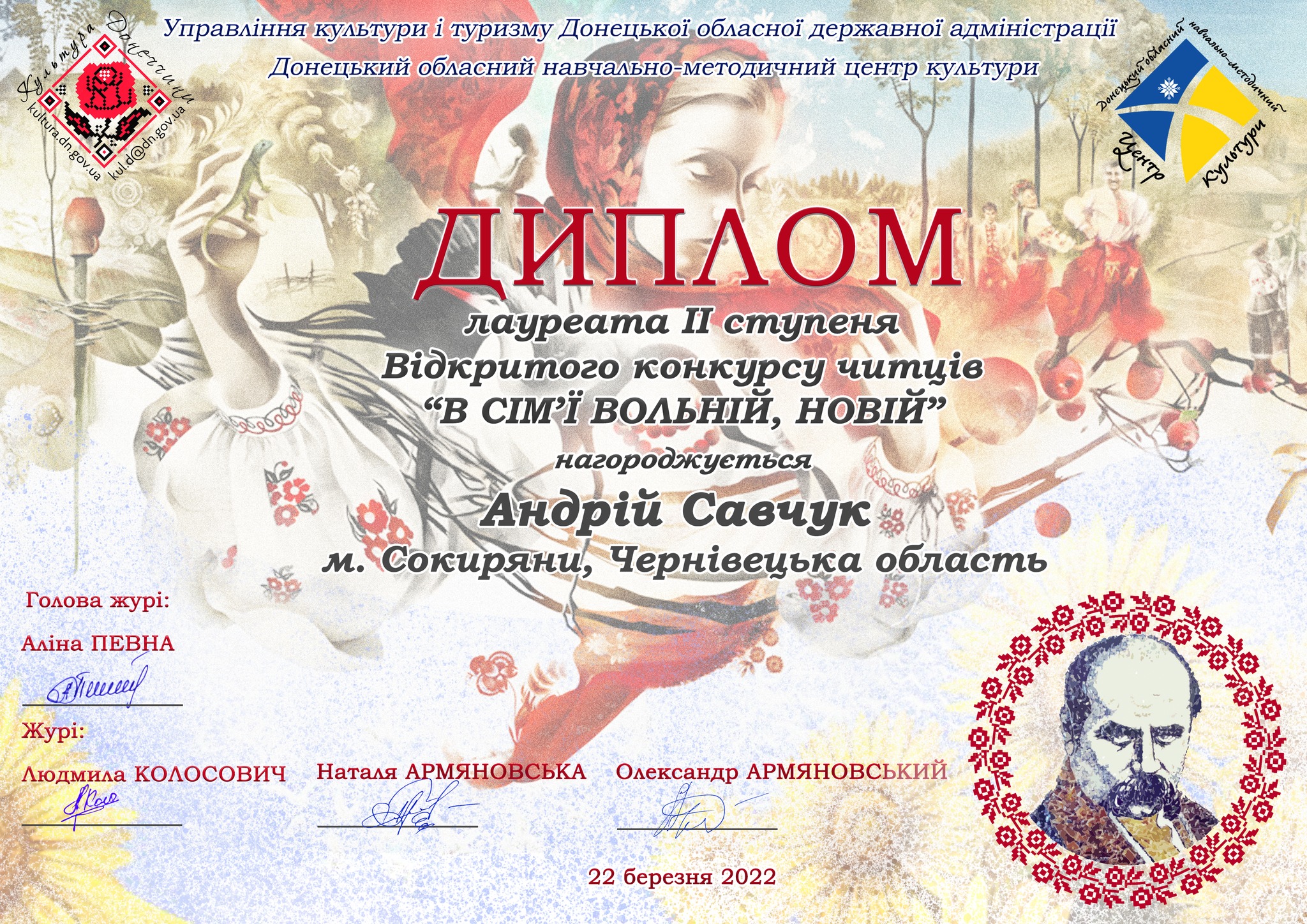 Нашу громаду гідно представив сокирянець Андрій Савчук. Андрій посів І місце в номінації «Аматорське мистецтво художнього слова». Хлопець зміг натхненно відтворити невмируще Шевченкове слово, яке надихає кожного з нас у час героїчної боротьби за власну ідентичність. Наставник Андрія Савчука – режисер будинку народної творчості та дозвілля м. Сокиряни Валерій Кукілюк.