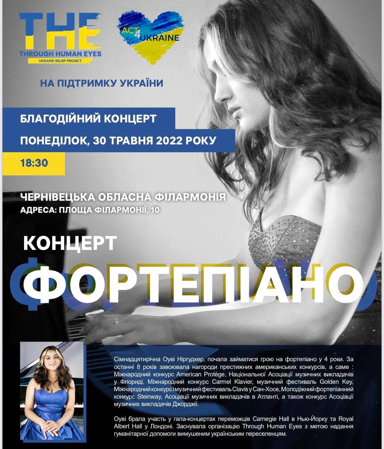 30 травня у Чернівцях піаністка Оуві Ніргудкер зі США зіграє благодійний концерт на користь України.