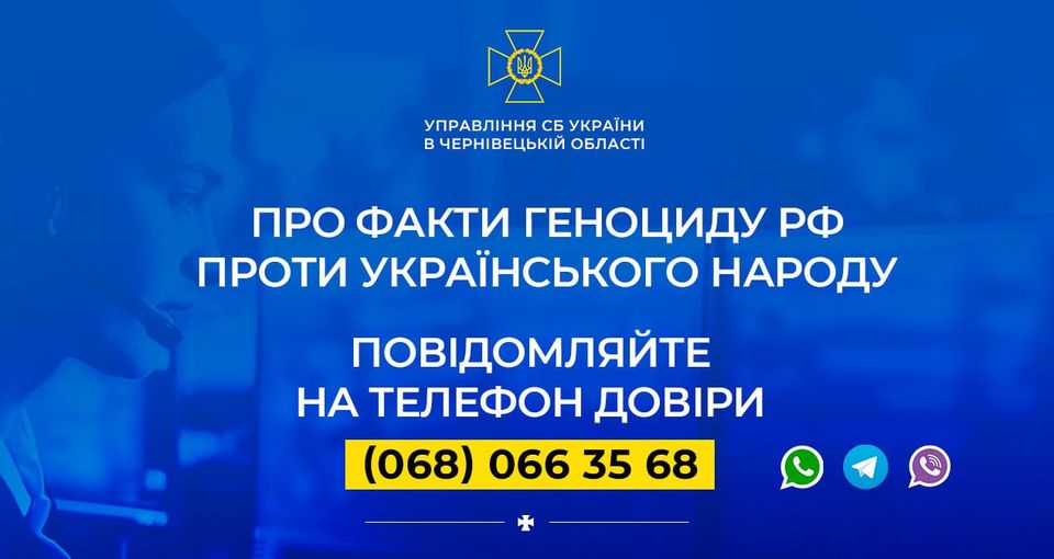 одержали тяжкі тілесні ушкодження, в тому числі й такі, що спричинили переривання та ускладнення вагітності, передчасні пологи, травмування і поранення вагітних жінок телефонуйте або надсилайте повідомлення в Telegram, WhatsApp чи Viber на «гарячу лінію» Управління СБ України в Чернівецькій області за номером 068 066 35 68.