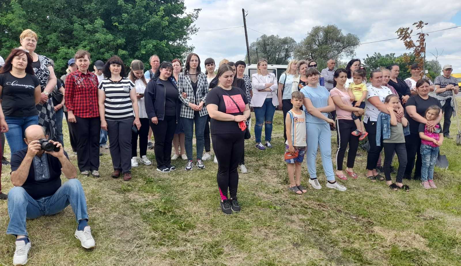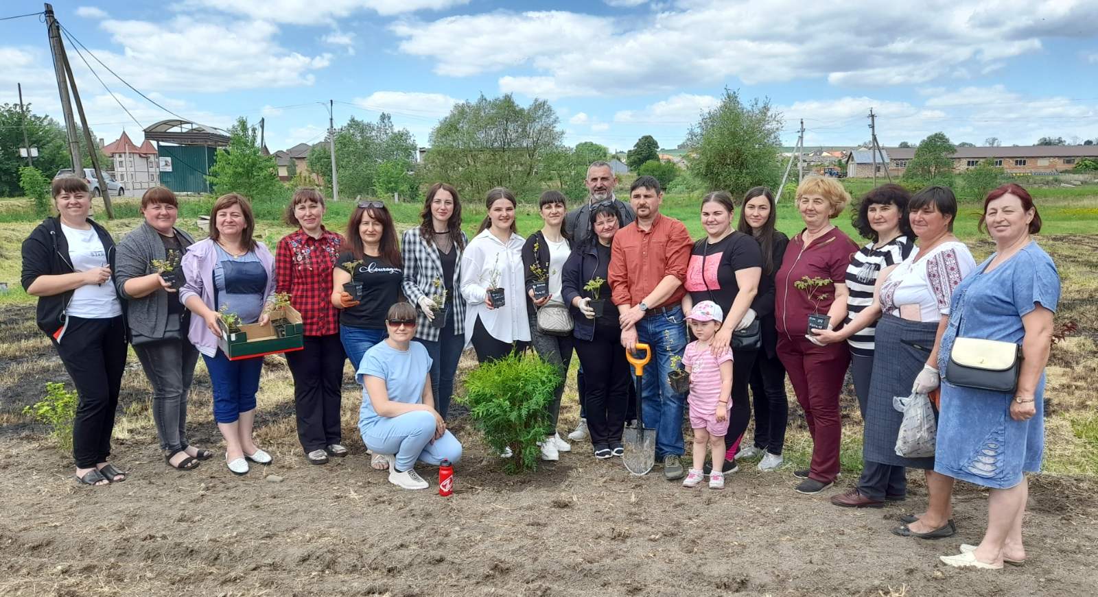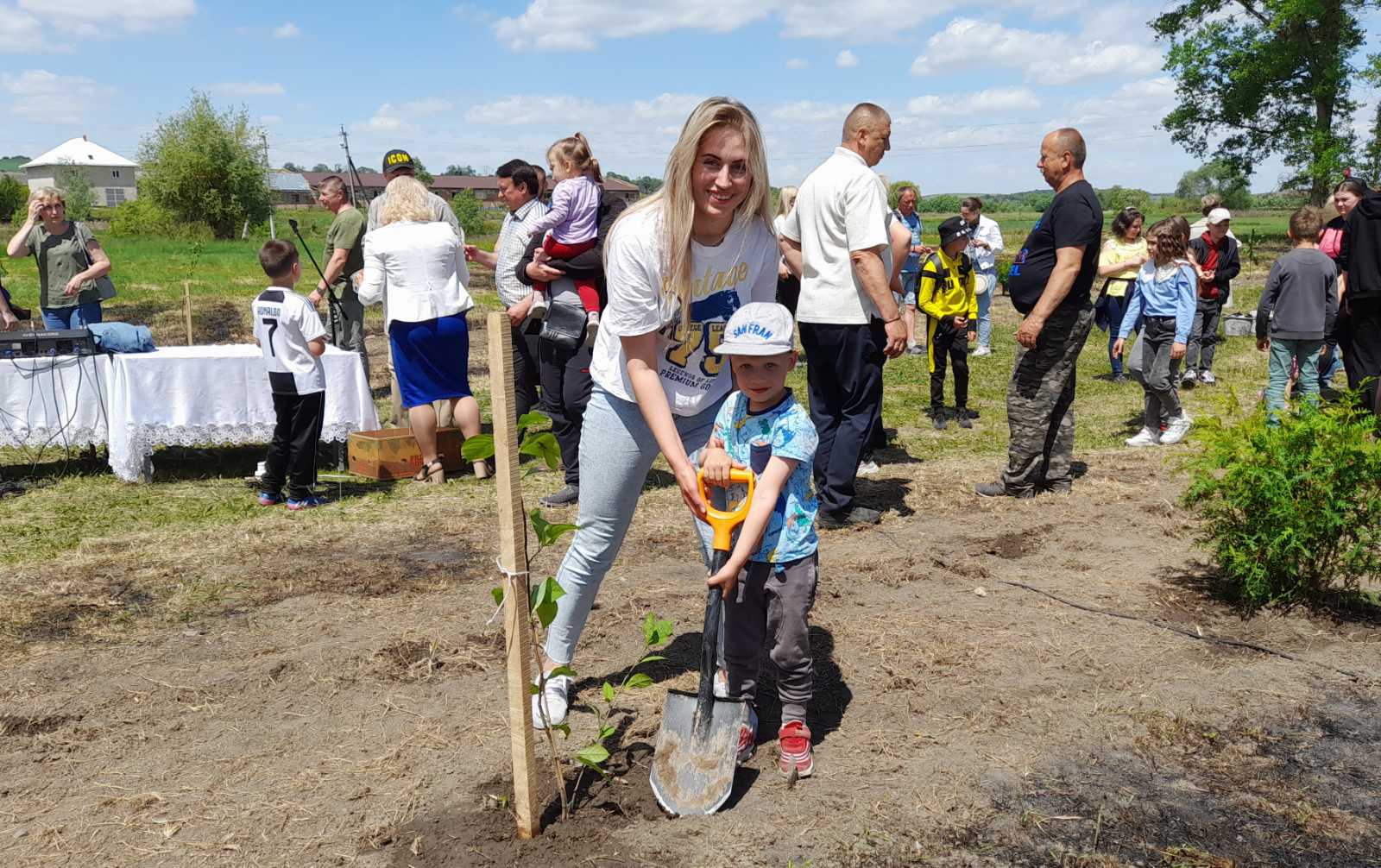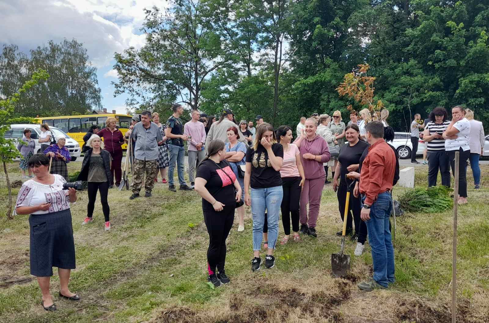 Атмосфера заходу дуже щира: висаджують деревця сім’ями, доєдналися учні місцевої школи на чолі з вчителями та директором МИКОЛОЮ БОДНАРЮКОМ, на акцію приїхали старости та переселенці з інших сіл громади. Люди знайомляться, підбадьорюють одне одного словами віри в перемогу!