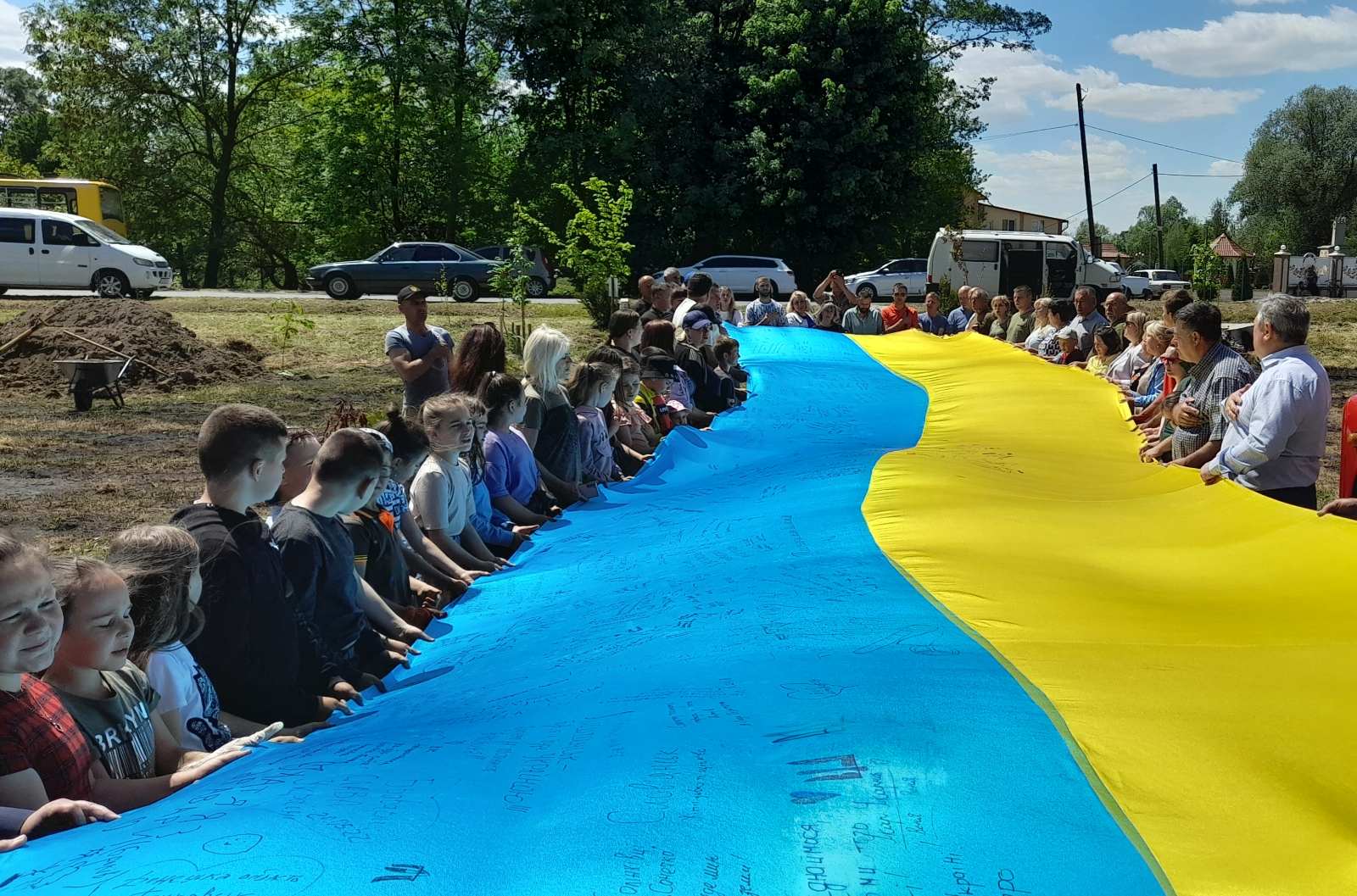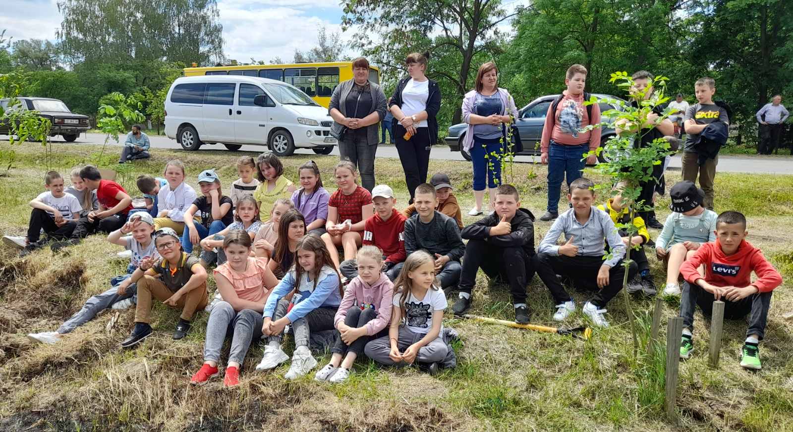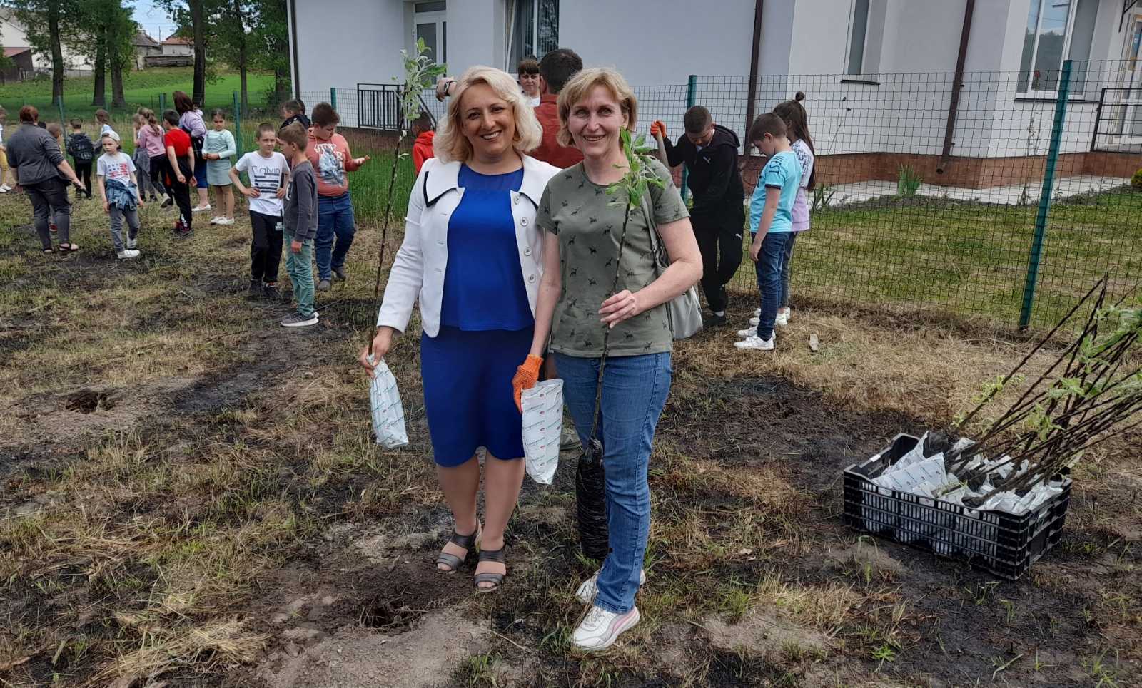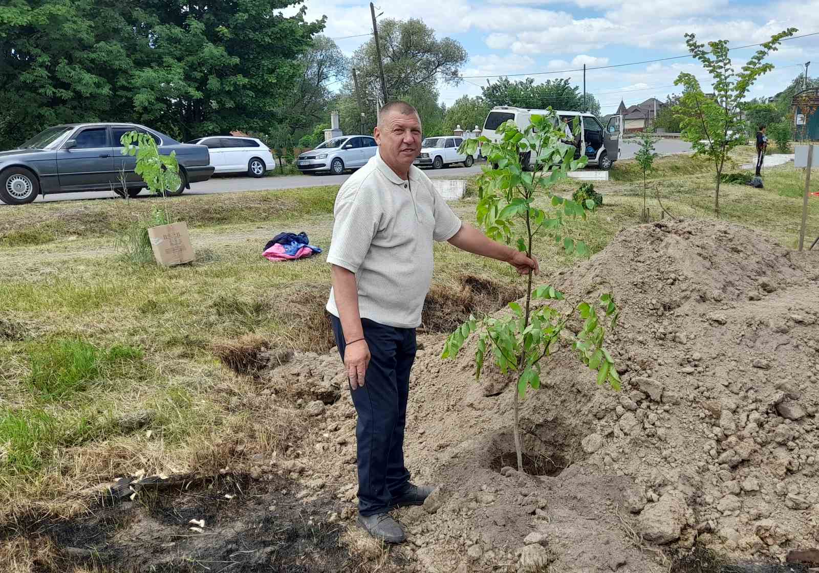 Атмосфера заходу дуже щира: висаджують деревця сім’ями, доєдналися учні місцевої школи на чолі з вчителями та директором МИКОЛОЮ БОДНАРЮКОМ, на акцію приїхали старости та переселенці з інших сіл громади. Люди знайомляться, підбадьорюють одне одного словами віри в перемогу!