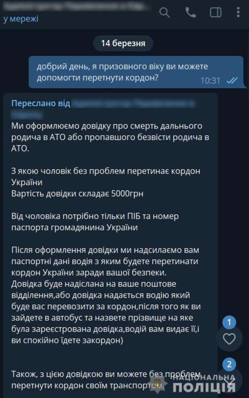 Щоб незаконно збагатитися за рахунок українців, які намагаються врятуватися від війни за кордоном, двоє 23-річних жителів Чернівецької області створили Telegram-канал під назвою «Перевезення в Європу». Через нього пропонували послуги міжнародних пасажирських перевезень, а також оформлення пакету документів для безперешкодного виїзду чоловіків з України в умовах воєнного стану. За бронювання одного місця шахраї вимагали 100 доларів США та надавали банківські рахунки, куди потерпілі надсилали гроші. Після отримання коштів порушники більше не виходили на зв’язок і блокували потерпілих.