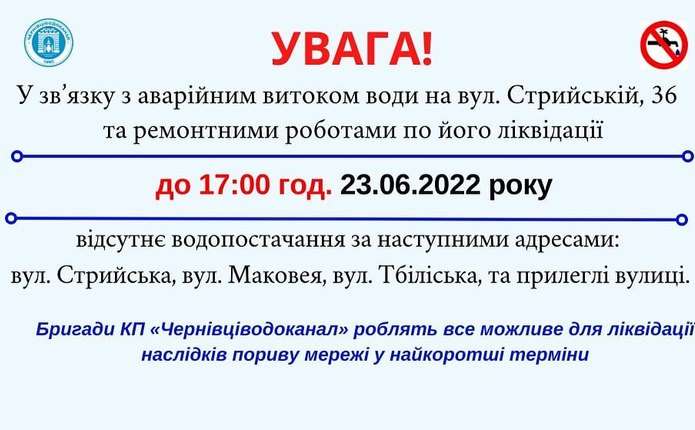 У Чернівцях, в зв’язку з проведенням ремонтних робіт по ліквідації аварійного витоку холодної води по вул. Стрийській, 36, до 17:00 год. 23 червня 2022 року буде відсутнє водопостачання на будинки по наступним вулицям: