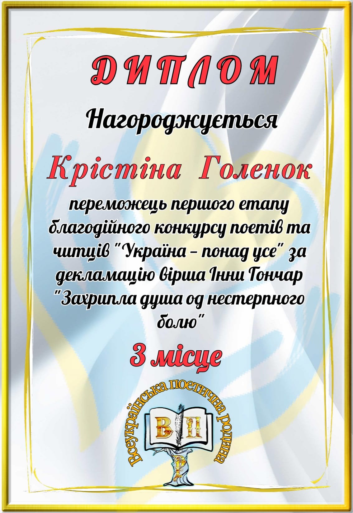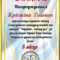 Приємно, що за відеодекламування іншого вірша цього ж автора диплом учасника отримав і син Крістіни Станіслав Захарченко.