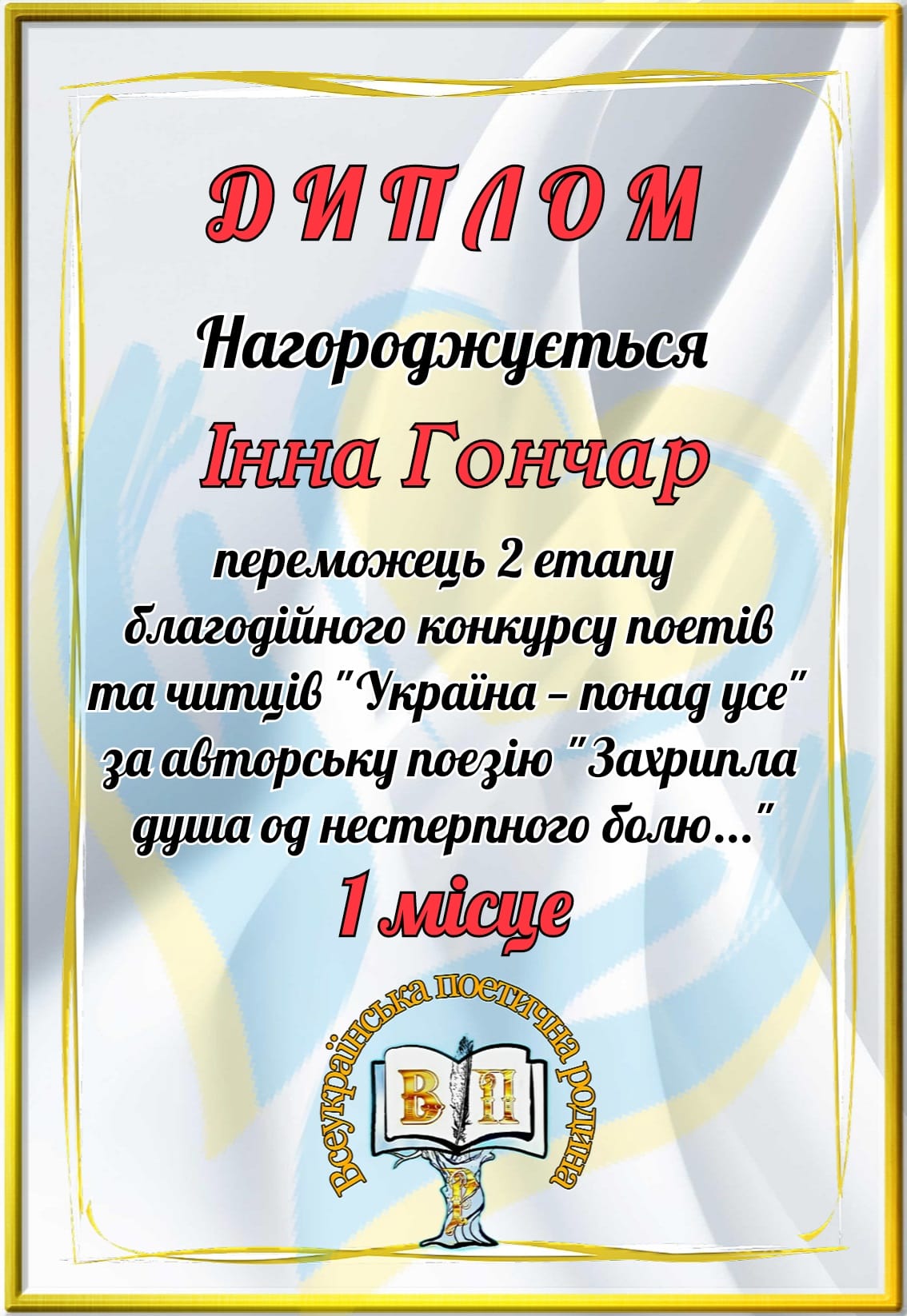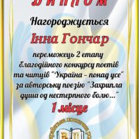 Тож своєю яскравою палітрою душі, енергією любові та нев’янучої віри в українську Перемогу поділився творчий тандем Дністровської ГАЕС Крістіна Голенок (відеодекламування) та Інна Гончар (автор вірша). На розсуд прихильників поетичного слова було представлено заримований невимовний біль, пережитий з усією Україною на межі 100 днів війни «Захрипла душа од нестерпного болю». За результатами голосування читачів Крістіна Голенок посіла третє місце, а автор Інна Гончар виборола перше місце!