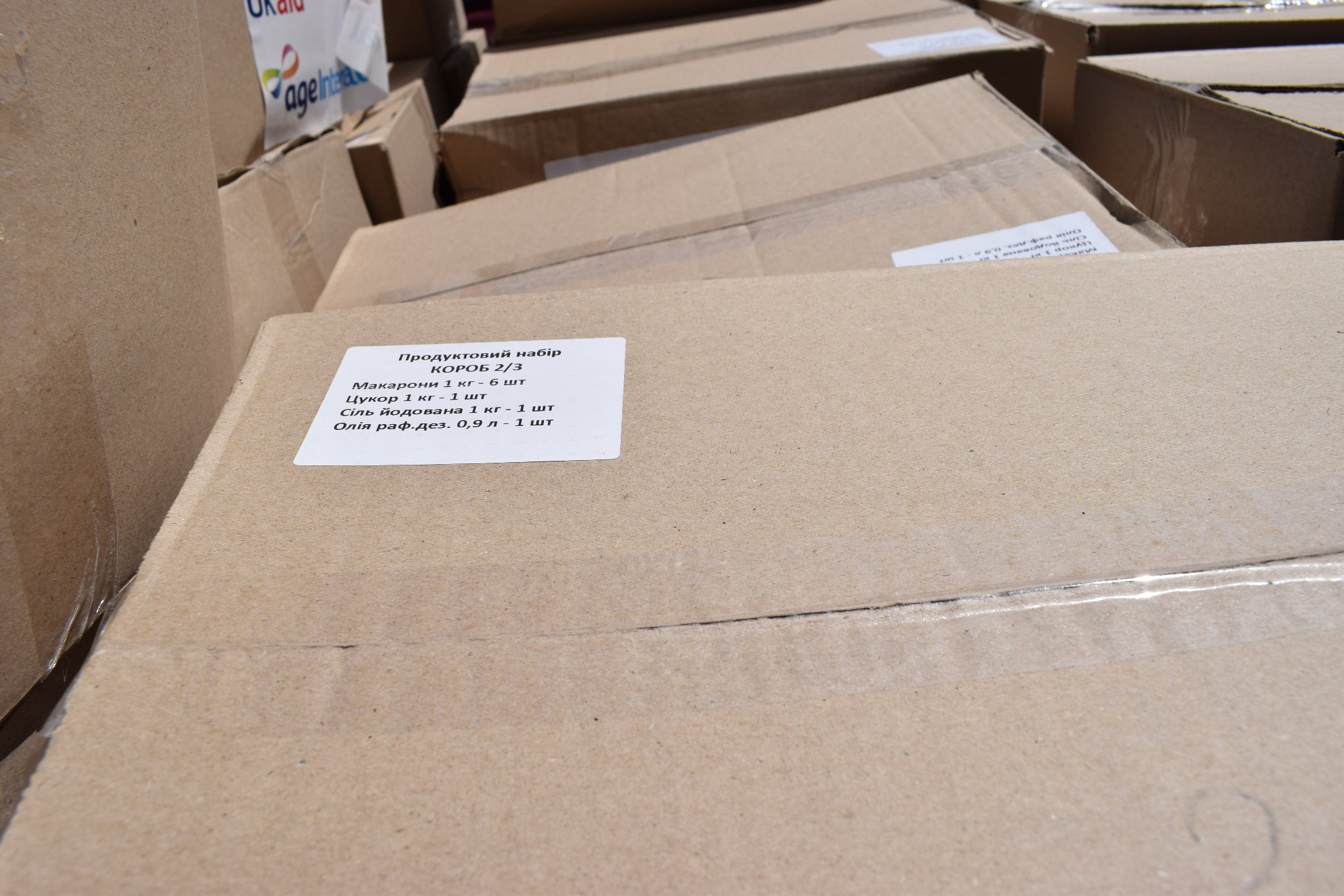 Пакунки містять цільні крупи, пластівці швидкого приготування, макарони, олію, м’ясні та рибні консерви, бобові, цукор та інше.