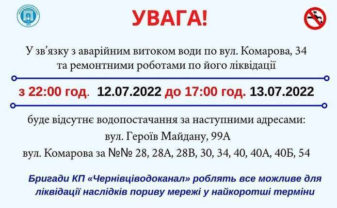 У зв’язку з аварійним витоком води по вулиці Комарова, 34 у Чернівцях та ремонтними роботами по його ліквідації, з 22.00 год. 12 липня до 17.00 год. 13 липня 2022 року буде відсутнє водопостачання за наступними адресами: