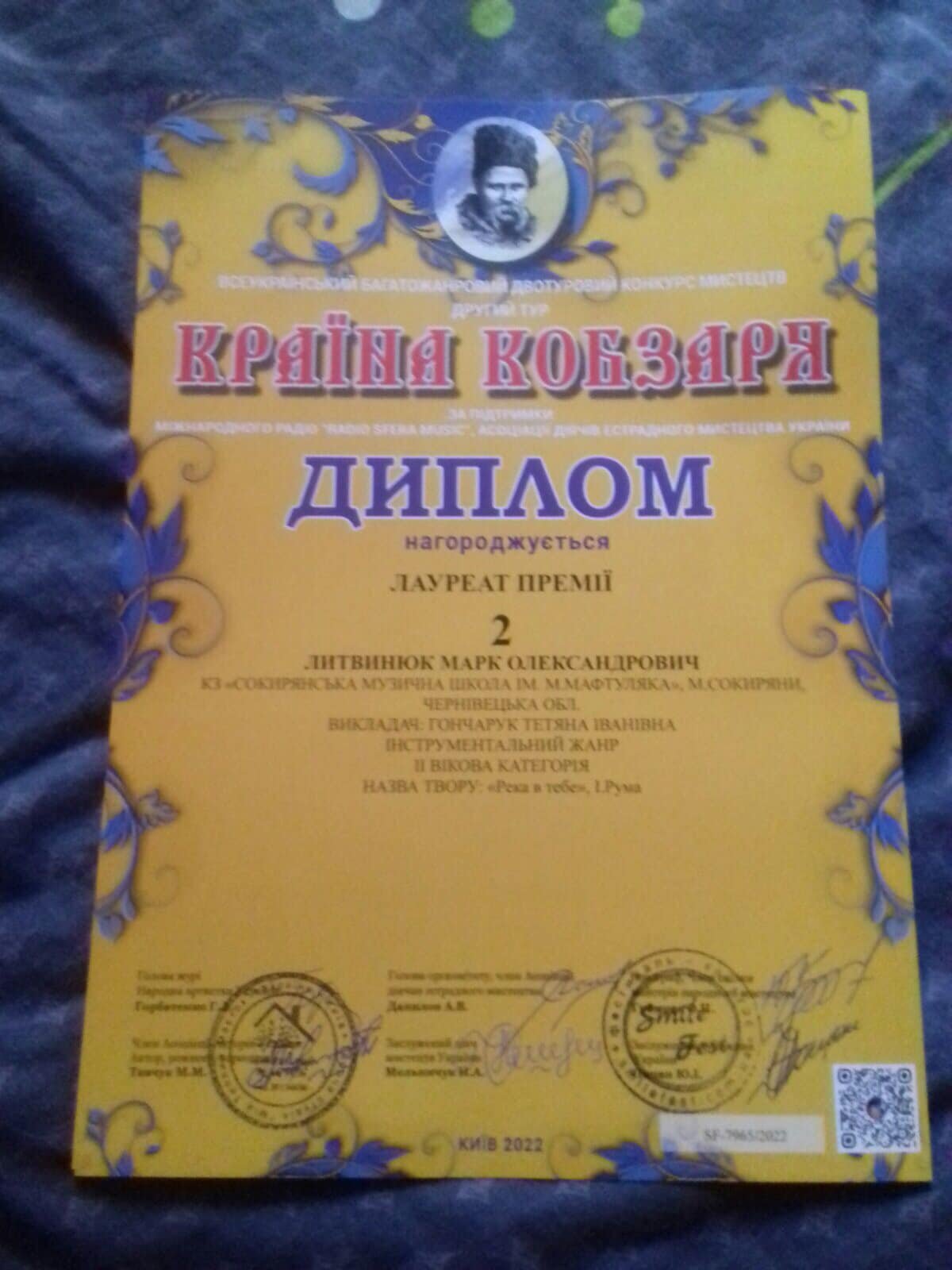 Відтак, днями, визначено переможців Всеукраїнського багатожанрового двотурового конкурсу мистецтв «Країна Кобзаря». Серед призерів – учень фортепіанного відділу Сокирянської музичної школи імені Михайла Мафтуляка, п’ятикласник Марк Литвинюк. Марк отримав медаль та диплом лауреата ІІ-ї премії. Наставниця хлопчика – Тетяна Іванівна Гончарук.