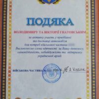 За самовідданість, небайдужість та підтримку української армії родину Гнатовських нагороджено Подякою командира військової частини.