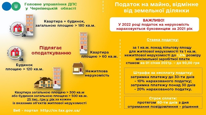Довідково. За наявності у власності платника податку об’єкта (об’єктів) житлової нерухомості, у тому числі його частки, загальна площа якого перевищує 300 квадратних метрів (для квартири) та/або 500 квадратних метрів (для будинку), сума податку збільшується на 25000 гривень на рік за кожен такий об’єкт житлової нерухомості (його частку).
