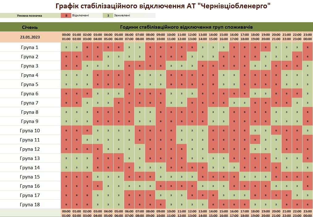 У Чернівецькій області оприлюднили графік стабілізаційних вимкнень електроенергії на сьогодні, 23 січня. Про це повідомляють в АТ «Чернівціобленерго».