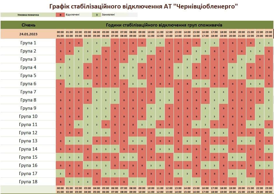 В Чернівецькій області опублікували оновлений графік стабілізаційних вимкнень електроенергії на 24 січня. Про це йдеться у повідомленні АТ «Чернівціобленерго».
