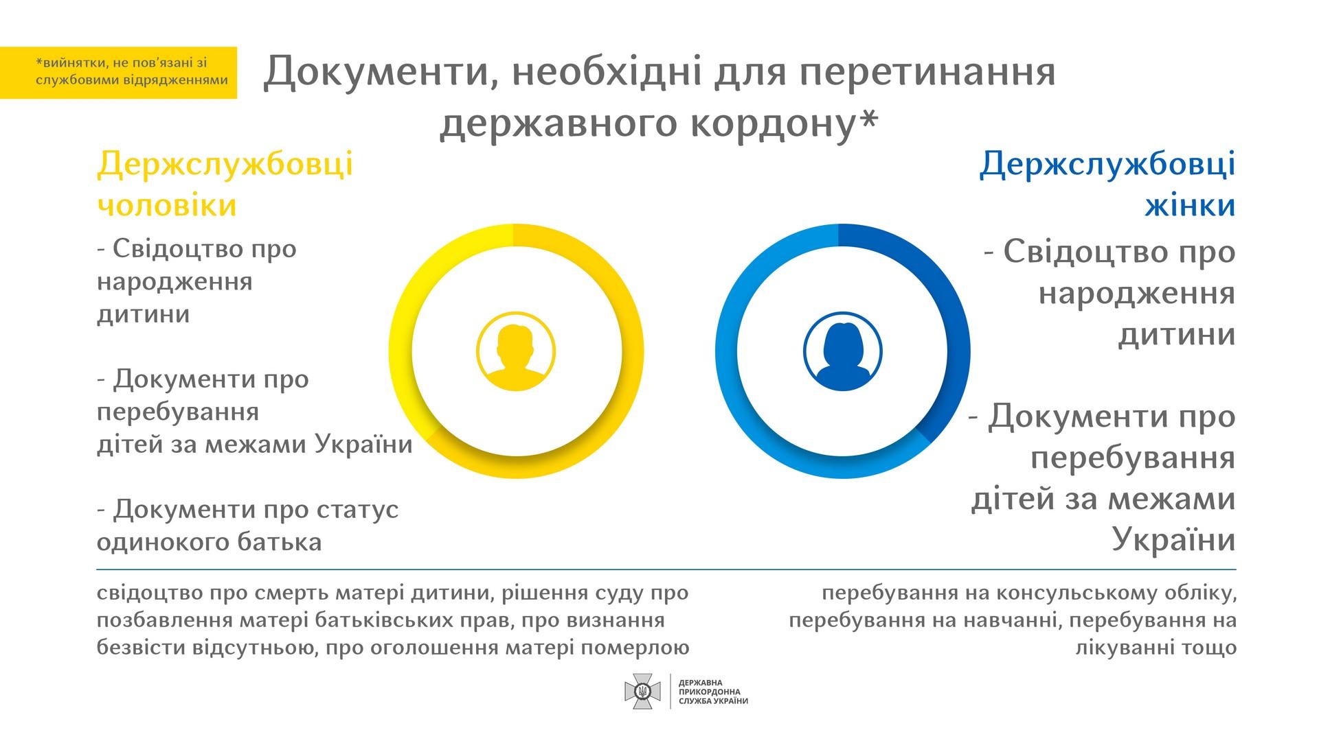 Так, під час виїзду жінок за межі України з метою відвідування таких дітей, які перебувають за межами України, окрім паспортного документу необхідно мати свідоцтво про народження дитини (дітей) і документи (їх нотаріально засвідчені копії), які б підтверджували перебування дітей за межами України. Серед них можуть бути – перебування на консульському обліку, перебування на навчанні, перебування на лікуванні тощо.