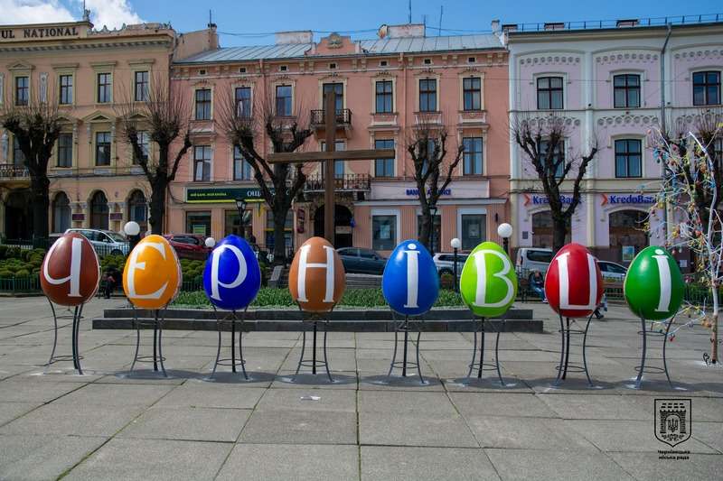 13 квітня 2023 року на Центральній площі Чернівців триває облаштування великодньої інсталяції. Встановлюють писанки, галунки та святкове дерево. Про це повідомляє Чернівецька міська рада у фейсбуці.