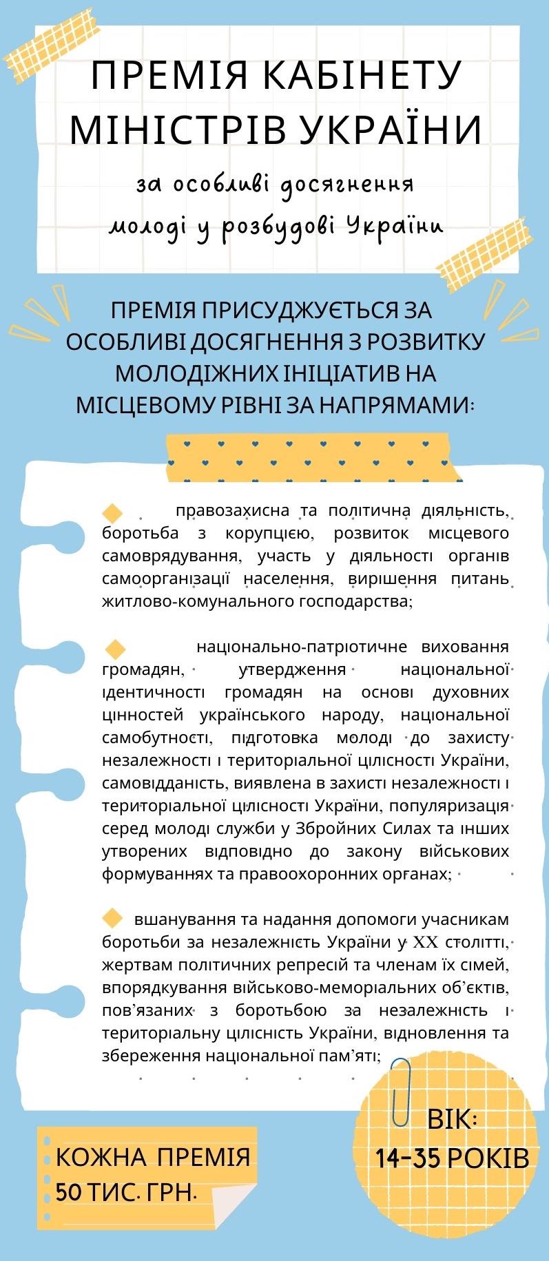 Важливо! Повний пакет документів надсилається на поштову адресу: 01601, м. Київ, вул. Еспланадна 42, каб. 313а. та e-mail: [email protected] (в темі листа вказати «Премія КМУ»).