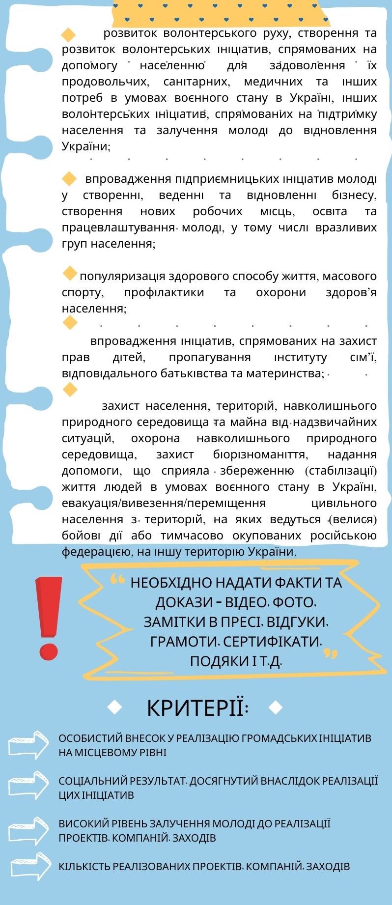 - характеристика кандидата на присудження Премії із зазначенням його досягнень (інформації про реалізовані молодіжні проекти та отриманий соціальний ефект) за підписом керівника;