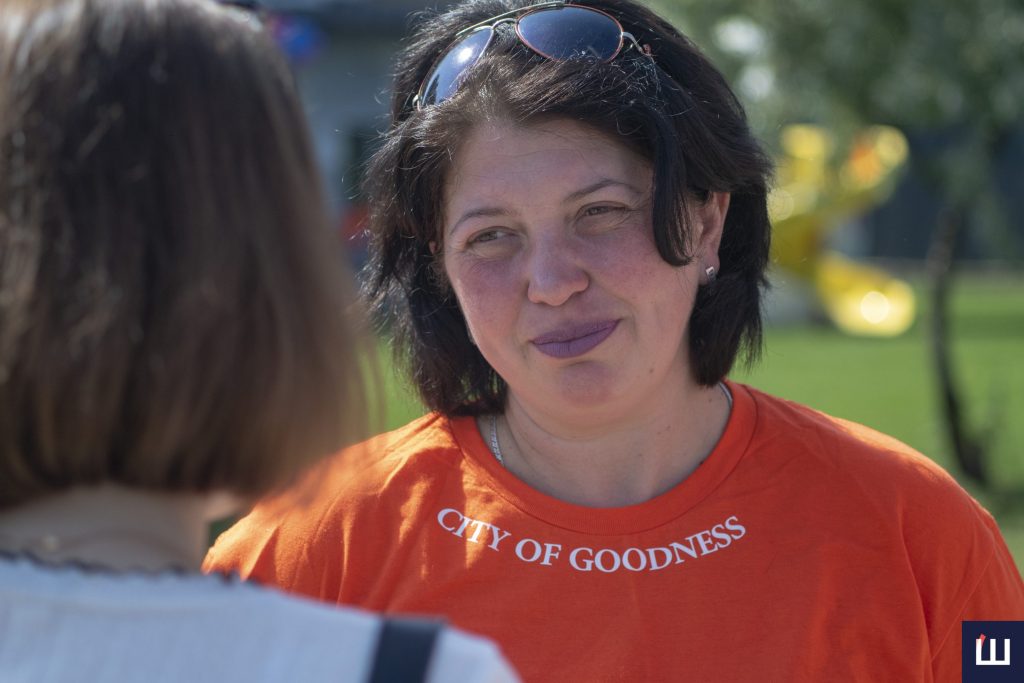 У натовпі знайомимося з Тетяною. Вона переїхала торік зі Слов’янська Донецької области та виховує у Місті добра шістьох дітей. Зараз вона допомагає тут песикам – купає, годує, вигулює та водить їх до ветеринара. А також пере дитячі речі. Її чоловік допомагає у будівництві.
