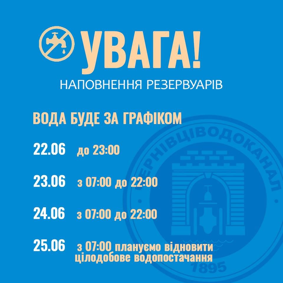 Відтак для мінімізації незручностей обмеження будуть вночі. Чернівчан просять зробити запаси води. Вимкнення відбуватиметься за графіком: