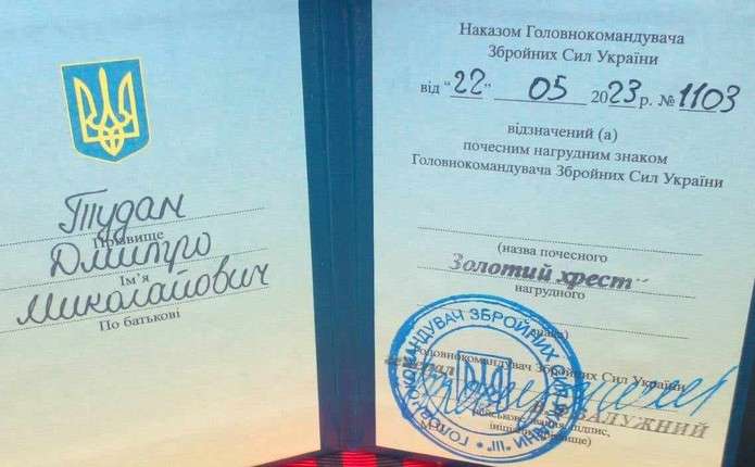 Головнокомандувач Збройних Сил України Валерій Залужний відзначив захисника з Буковини почесним нагрудним знаком «Золотий хрест». Високої нагороди удостоївся житель Берегомета, воїн 3-ї окремої штурмової бригади Дмитро Тудан, повідомляє Чернівецька обласна рада.