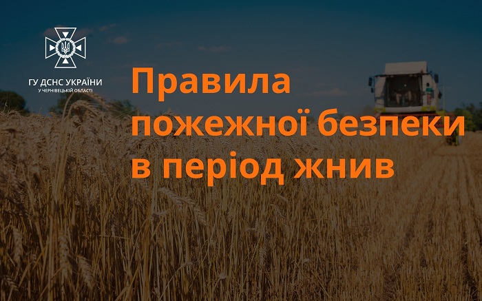 Розпочався важливий період – жнива. У цей час особлива увага рятувальників прикута до запобігання виникненню пожеж на полях. Тому Головне управління ДСНС України у Чернівецькій області наголошує громадянам на основних правилах безпеки, яких обов’язково слід дотримуватись, щоб зберегти врожай від вогню: