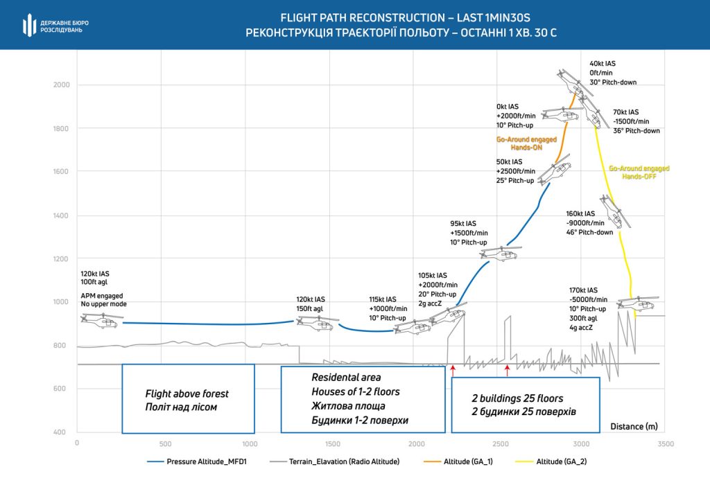 Командир екіпажу побачив перешкоду — багатоповерховий будинок — і почав здійснювати маневр обльоту, але різко піднявся, втратив орієнтування в просторі та під час завершення маневру допустив зіткнення із землею. Як зазначає ДБР — через відсутність необхідних навичок.