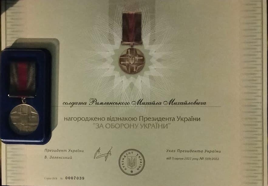 Відзнаку президента «За оборону України» отримав житель Сокирянщини, військовий Михайло Римлянський.